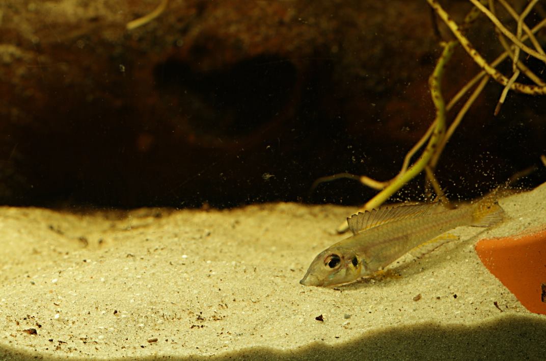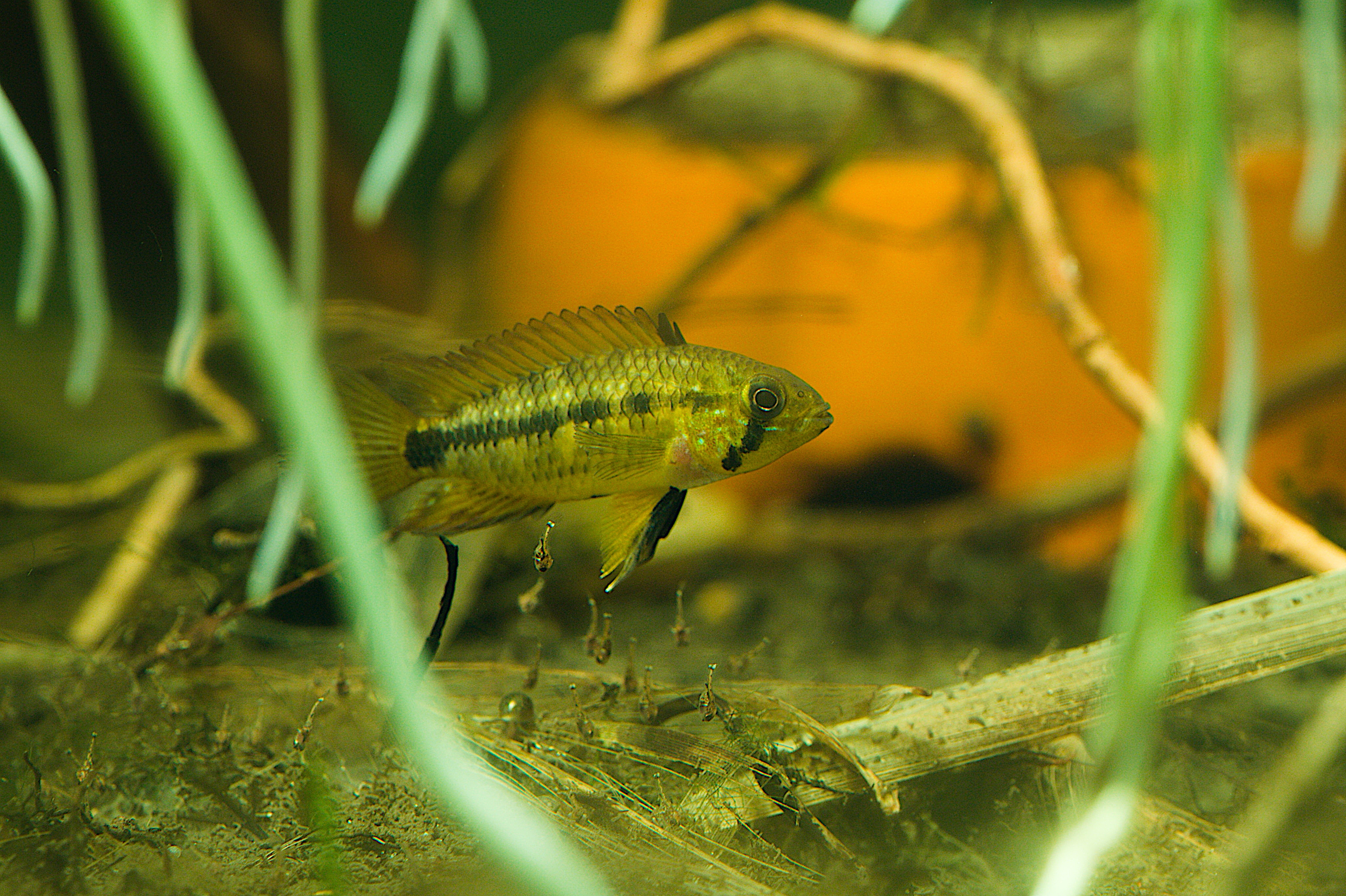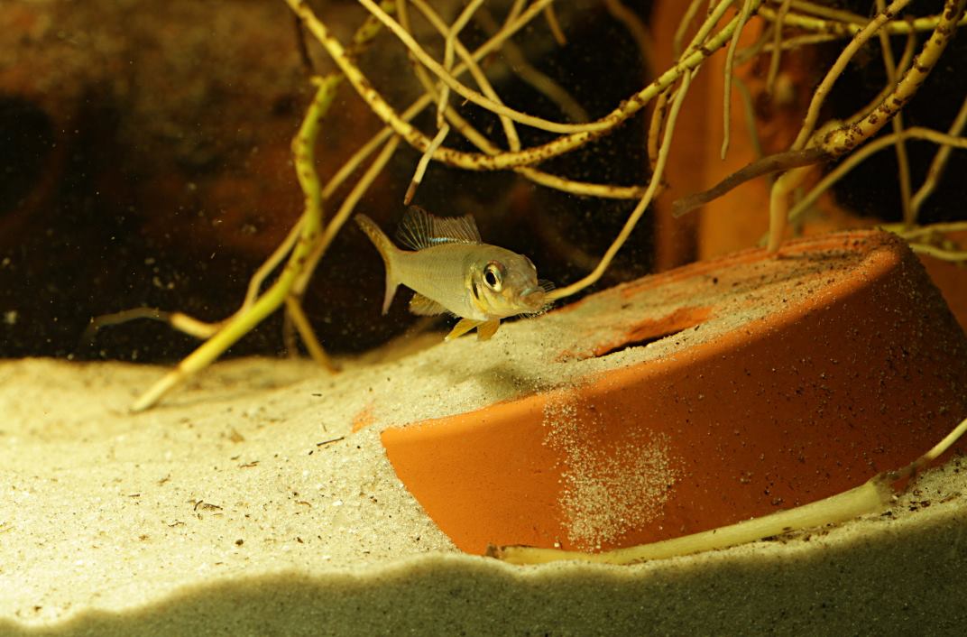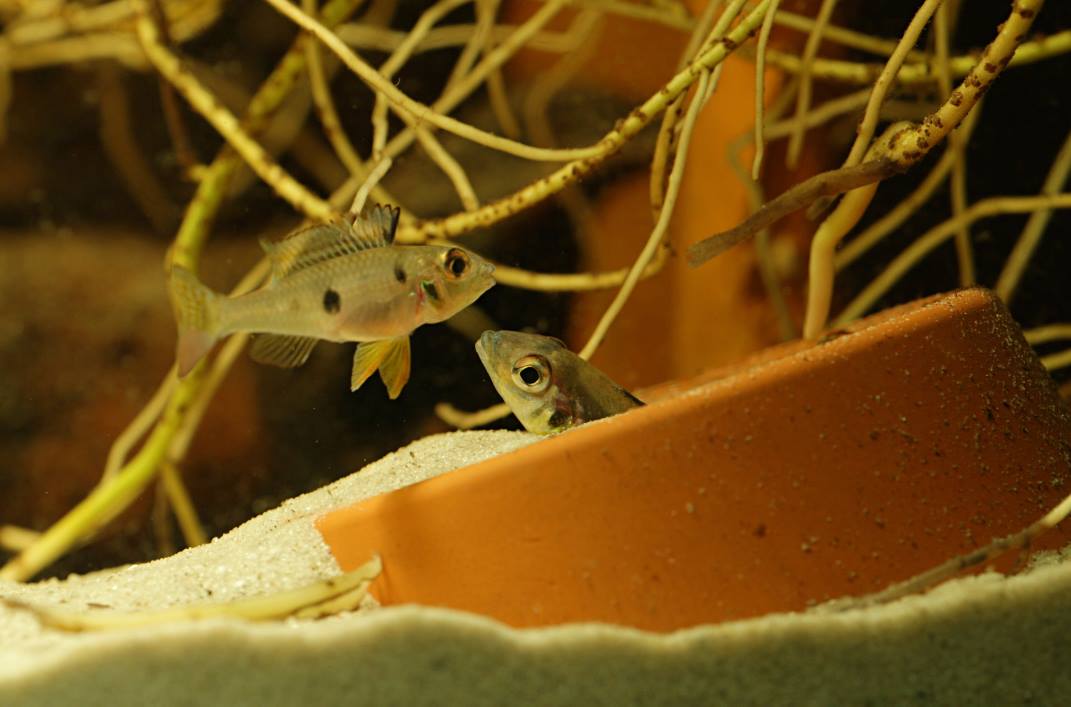 Jungfische konnte ich leider nie beobachten, trotzdem balzten die Tiere regelmäßig und verschwanden in der Höhle. Nach erneuten heftigen Revierstreitigkeiten musste ich ein totes Männchen sowie ein Weibchen herausfischen. Die innerartliche Aggressivität unter B. opercularis ist wirklich hoch. Während sich die nah verwandten Dicrossus filamentosus auf dieser Grundfläche problemlos als Gruppe halten lassen, ist die Gruppenhaltung von B. opercularis anscheinend eine Herausforderung. Nachdem ich nun nur noch drei Tiere hatte, zogen diese in ein kleineres Aquarium mit einem Volumen von 100 Litern und den Maßen 80x30x40 cm (LxBxH) um. Auch dort balzte das Pärchen regelmäßig und bereitete ab und zu einen umgedrehten Tontopf vor. Auch hier konnte ich nie Jungfische beobachten.