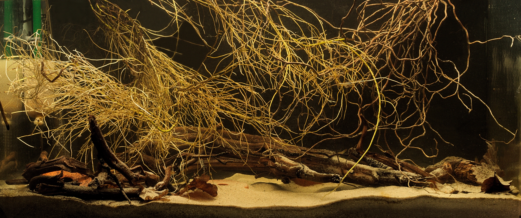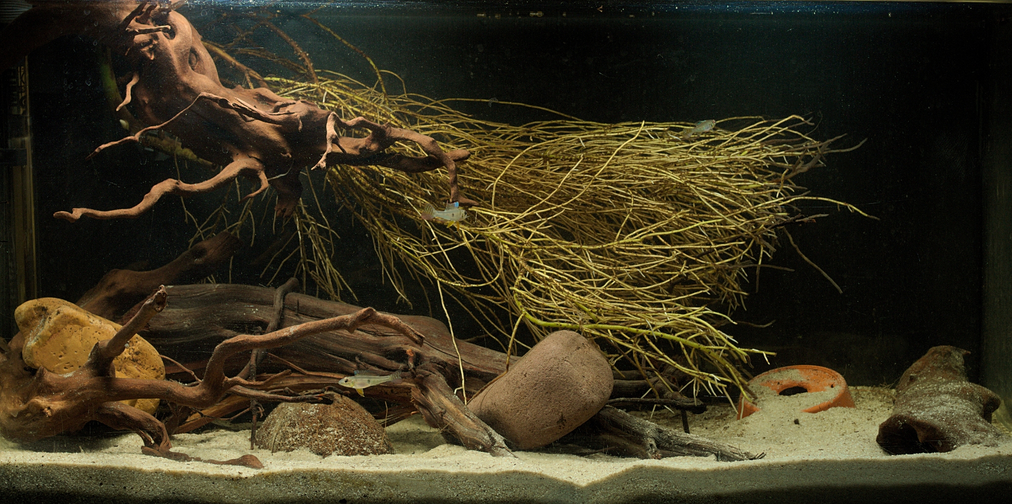 Ich pflegte die Gruppe bestehend aus fünf Tieren zunächst in einem 100x40x50 cm (LxBxH) großen Aquarium (200 Liter). Das Aquarium wurde mit Sand befüllt, enthielt strukturgebende Mangrovenwurzeln, Eichenlaub, einige Nussschalen und Blumentöpfe als Höhlen, einige auf Lavagestein aufgebunde Javafarne sowie Wurzeln einer Efeutute. Bereits nach wenigen Tagen bildete sich ein Pärchen, welches die freie Sandfläche für sich beanspruchte und vehement gegen die drei restlichen Artgenossen verteidigte, welche fortan im Unterholz leben mussten. Schnell zeigte sich die hohe innerartliche Aggressivität dieser Art. Rückblickend betrachtet war das Aquarium zu offen gestaltet und hätte mehr strukturgebende Sichtschutzelemente in der Beckenmitte benötigt.