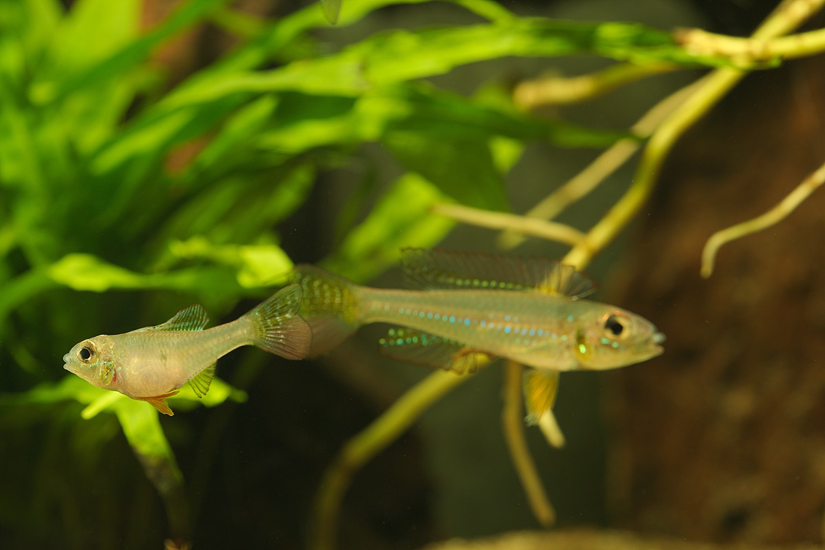 Biotoecus opercularis zählen zu den für meinen Geschmack schönsten und interessantesten Zwergbuntbarschen. Aus den grauen Mauerblümchen im Händlerbecken wurden glänzend schillernde Tiere mit sehr interessantem Charakter. Untereinander sind diese Zwergbuntbarsche wirklich ruppig, das musste ich auf die harte Tour lernen. Da mir die Nachzucht von B. opercularis nicht gelungen ist, werde ich mich irgendwann nochmal dieser Art widmen. Dann werde ich die Tiere jedoch direkt auf einer deutlich größeren Grundfläche halten (bspw. 140x60 cm) und unterschiedliche freie Sandflächen voneinander klarer abgrenzen.