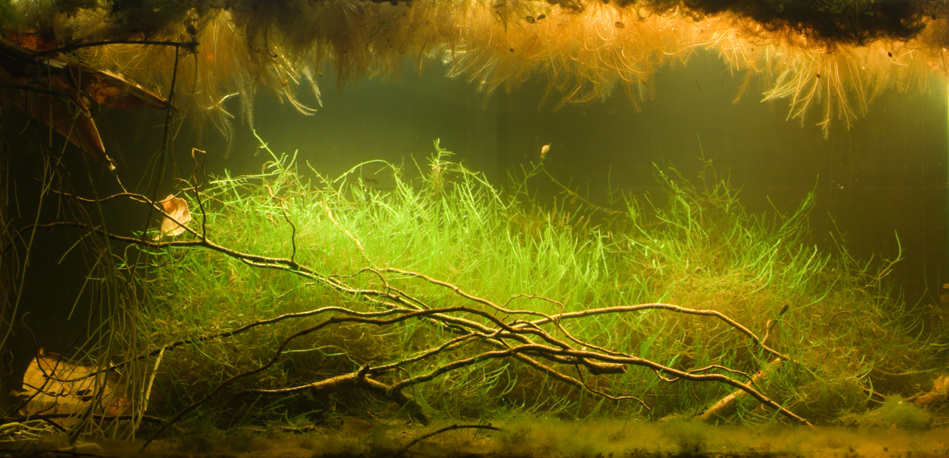 Etwa zwei Dutzend A. commbrae unterschieldicher Altersklassen leben in einem Altwasserbecken. Nach dem Umzug der Tiere in das 100x60x40 cm Becken habe ich keinen Wasserwechsel mehr durchgeführt. Ich fülle lediglich verdunstetes Wasser auf (mal mit Regenwasser, mal mit Leitungswasser). Wichtig scheint der verkrautete Charakter des Aquariums zu sein. Das Verhältnis von Fischmasse, Pflanzenmasse, Mulm und Wasservolumen funktioniert offensichtlich sehr gut und läuft sehr stabil. In dem Aquarium leben auch Kleinstlebewesen wie Hüpferlinge. Besonders die juvenilen Tiere sieht man häufig unter bzw. in der dichten Schwimmpflanzendecke lauern.