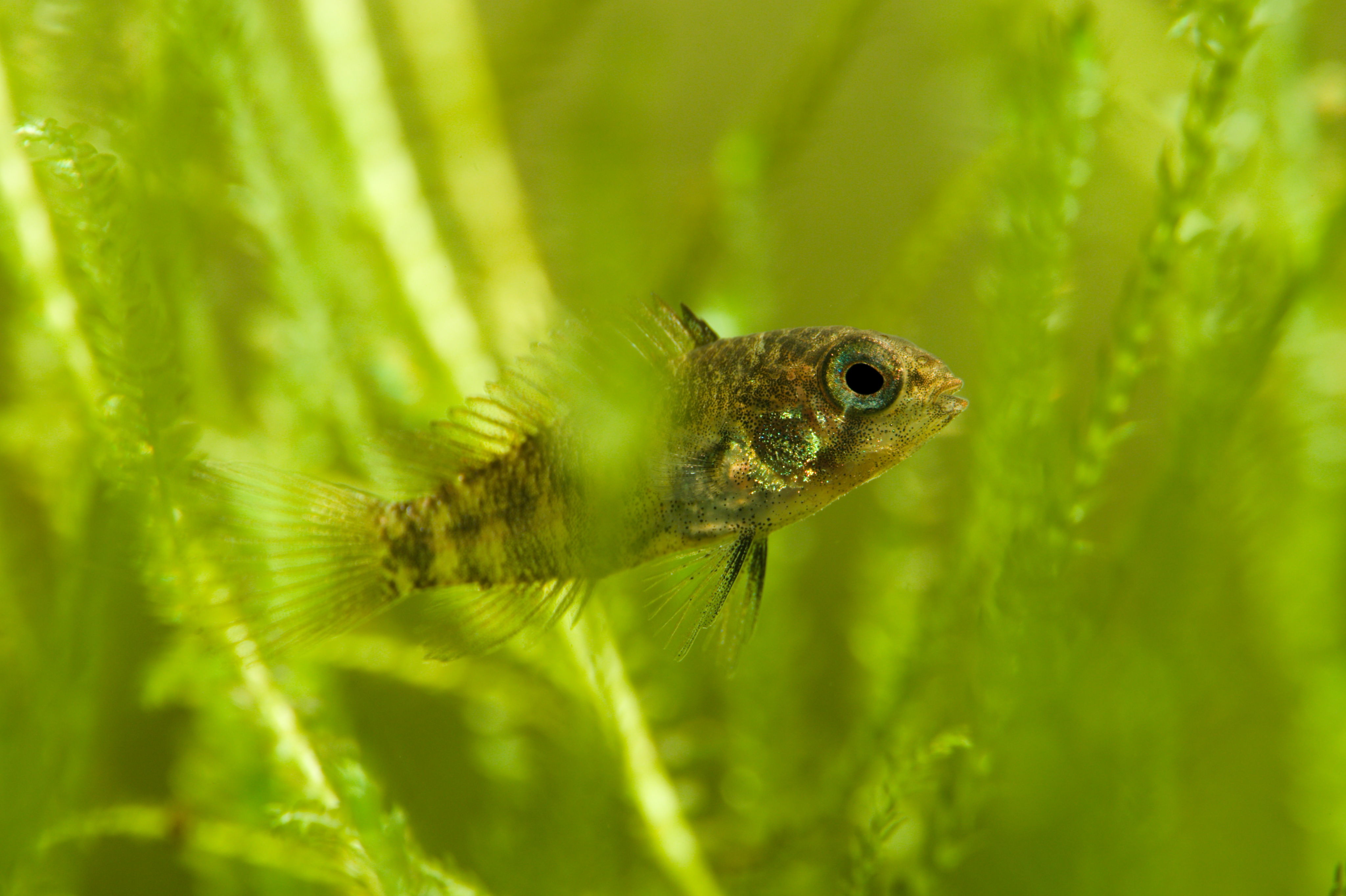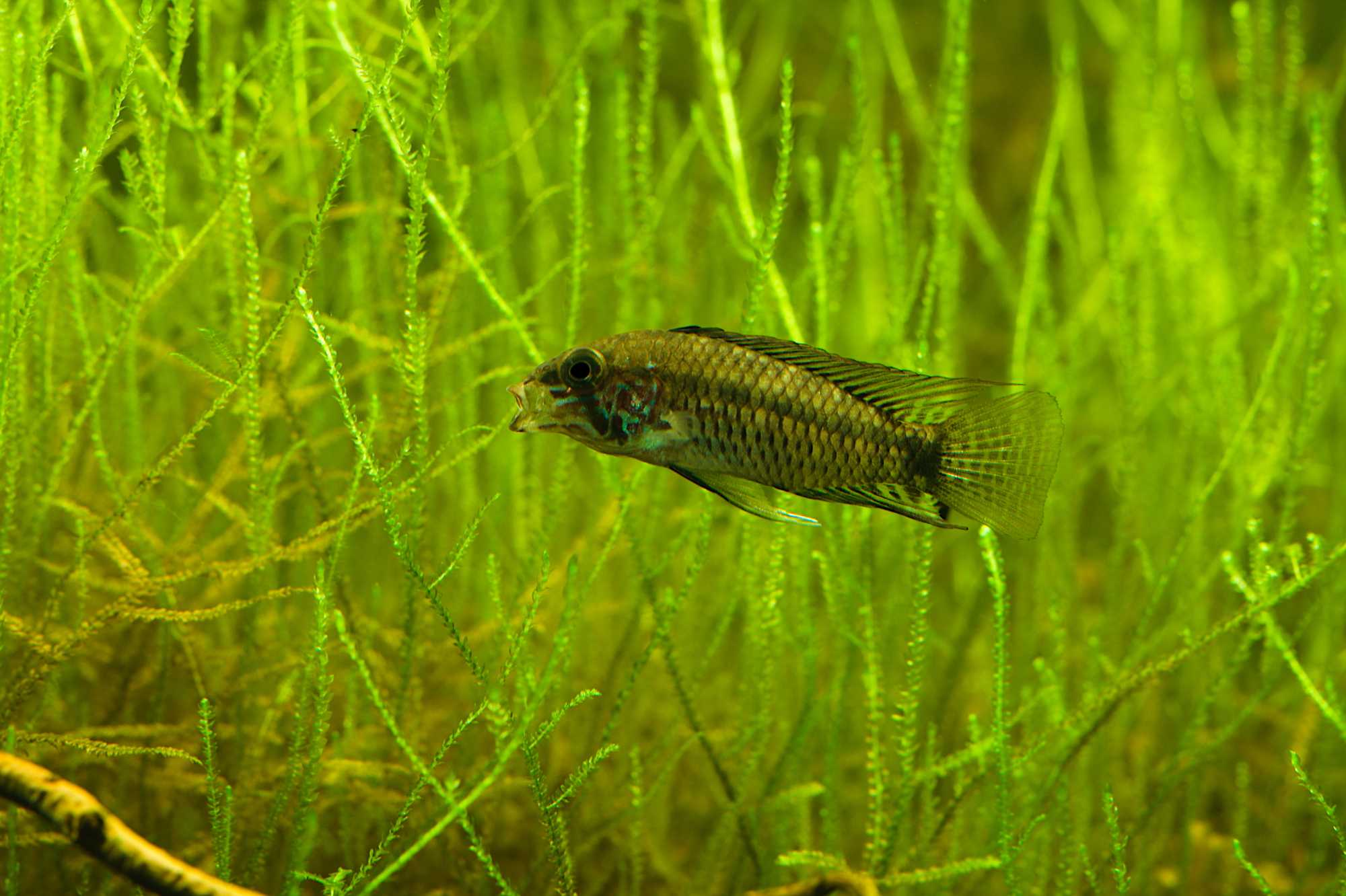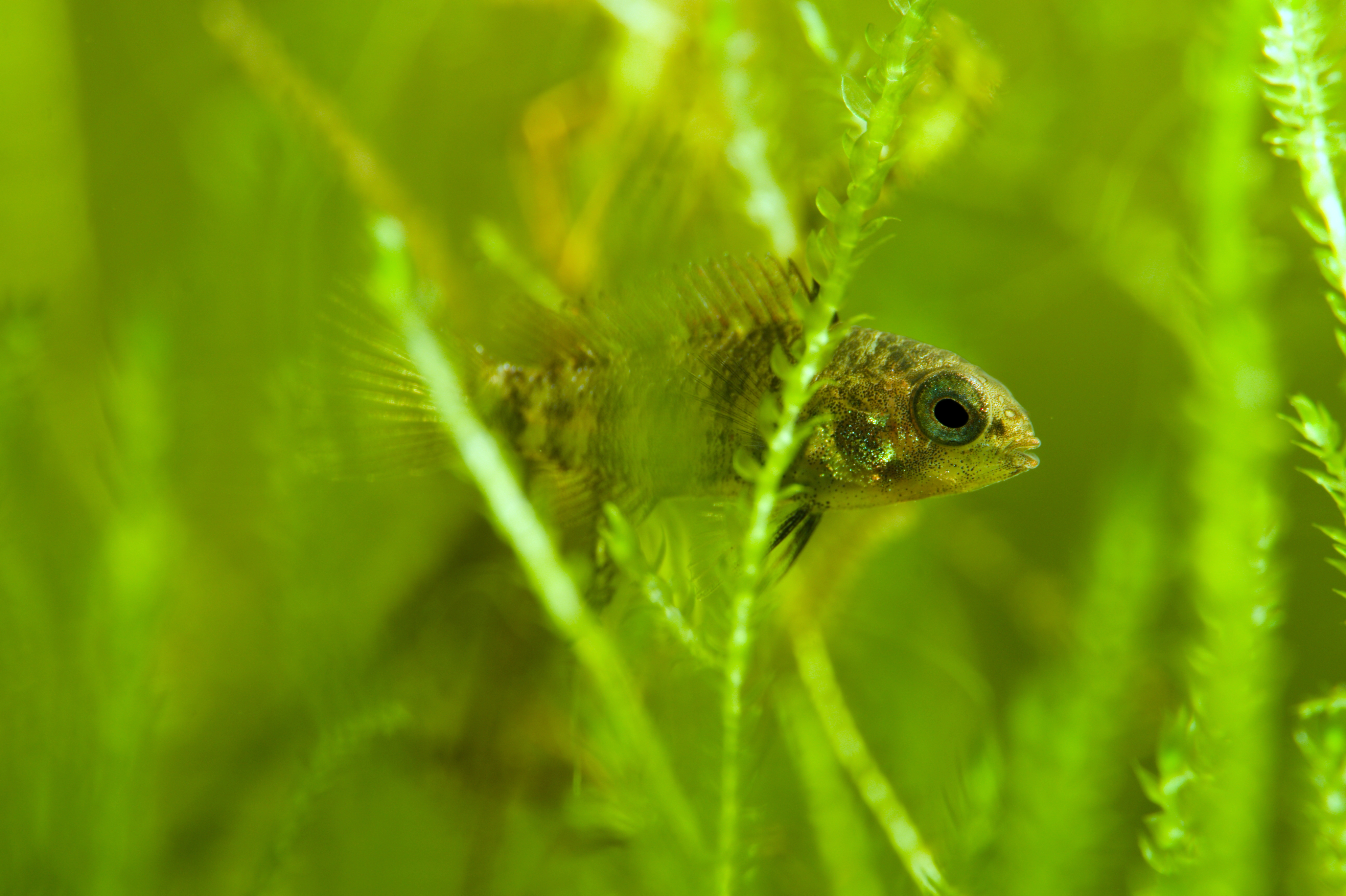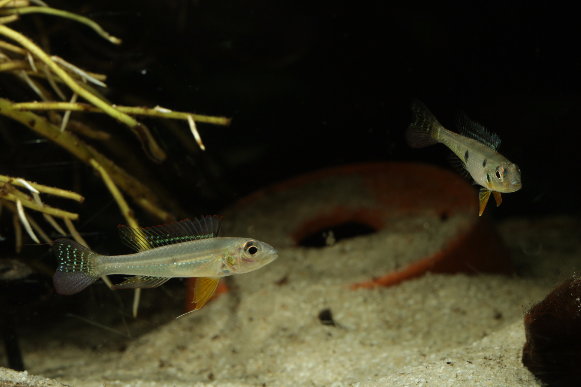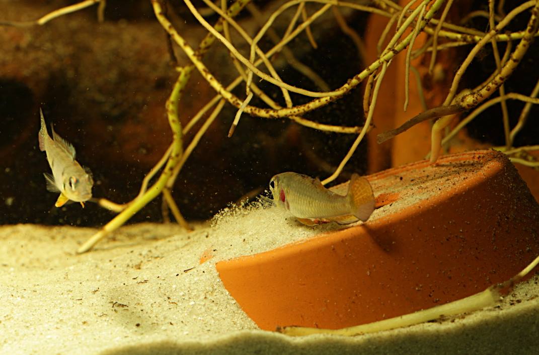 Jungfische konnte ich leider nie beobachten, trotzdem balzten die Tiere regelmäßig und verschwanden in der Höhle. Nach erneuten heftigen Revierstreitigkeiten musste ich ein totes Männchen sowie ein Weibchen herausfischen. Die innerartliche Aggressivität unter B. opercularis ist wirklich hoch. Während sich die nah verwandten Dicrossus filamentosus auf dieser Grundfläche problemlos als Gruppe halten lassen, ist die Gruppenhaltung von B. opercularis anscheinend eine Herausforderung. Nachdem ich nun nur noch drei Tiere hatte, zogen diese in ein kleineres Aquarium mit einem Volumen von 100 Litern und den Maßen 80x30x40 cm (LxBxH) um. Auch dort balzte das Pärchen regelmäßig und bereitete ab und zu einen umgedrehten Tontopf vor. Auch hier konnte ich nie Jungfische beobachten.
