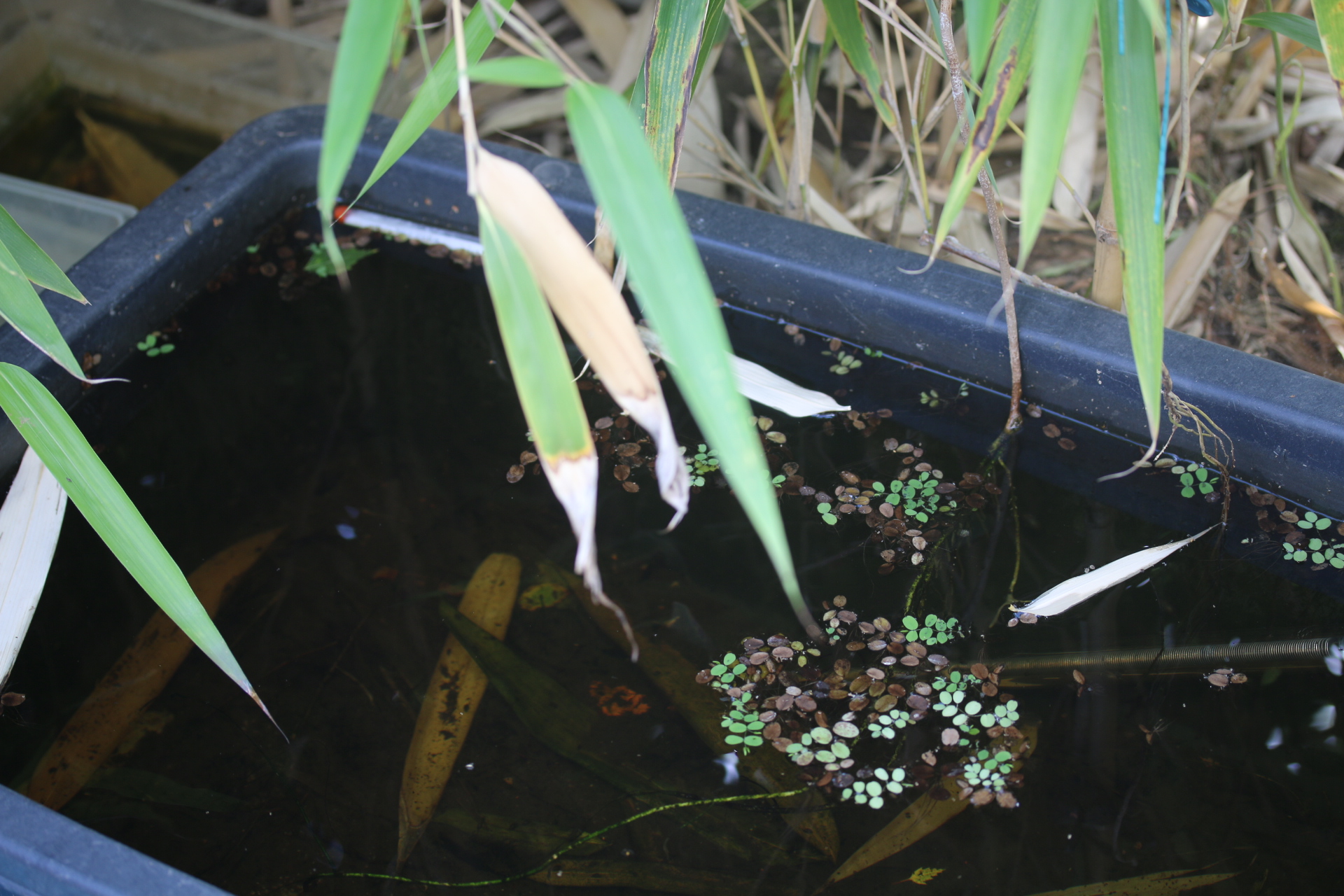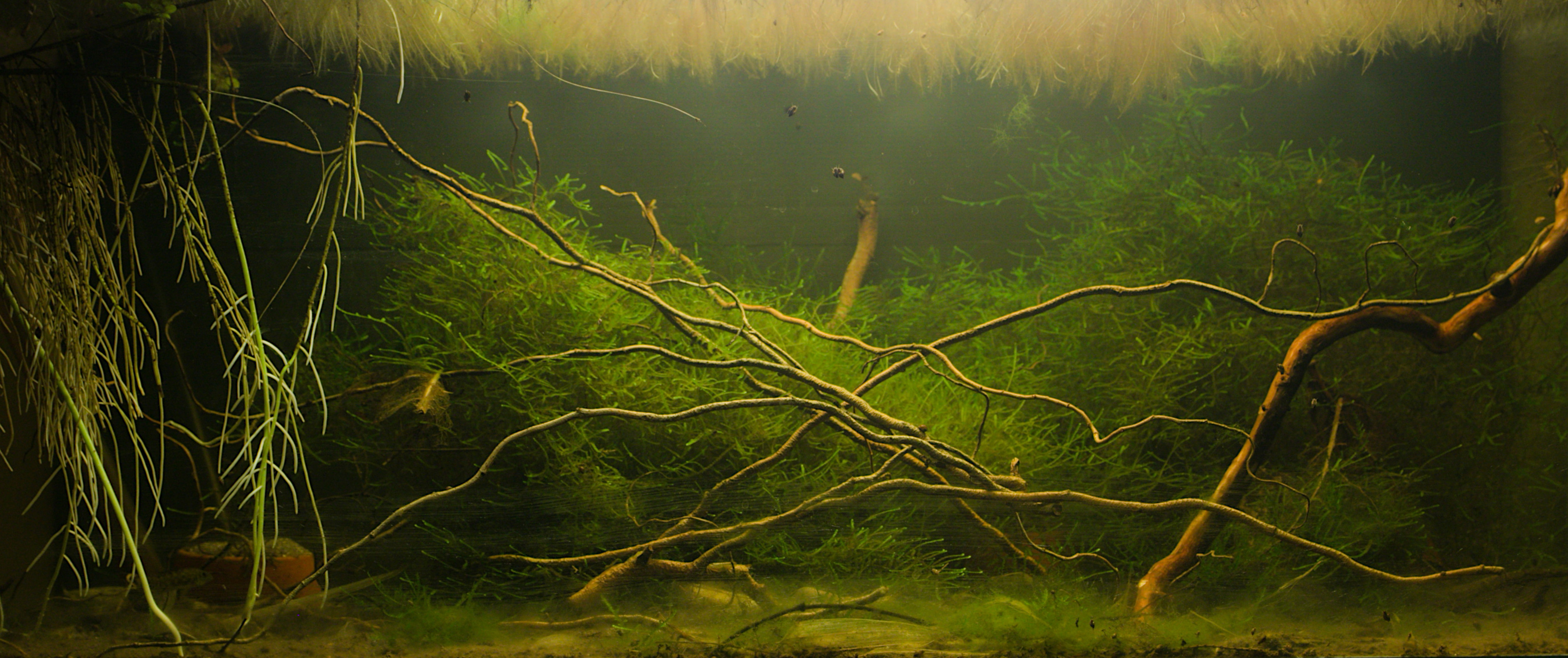 Etwa zwei Dutzend A. commbrae unterschieldicher Altersklassen leben in einem Altwasserbecken. Nach dem Umzug der Tiere in das 100x60x40 cm Becken habe ich keinen Wasserwechsel mehr durchgeführt. Ich fülle lediglich verdunstetes Wasser auf (mal mit Regenwasser, mal mit Leitungswasser). Wichtig scheint der verkrautete Charakter des Aquariums zu sein. Das Verhältnis von Fischmasse, Pflanzenmasse, Mulm und Wasservolumen funktioniert offensichtlich sehr gut und läuft sehr stabil. In dem Aquarium leben auch Kleinstlebewesen wie Hüpferlinge. Besonders die juvenilen Tiere sieht man häufig unter bzw. in der dichten Schwimmpflanzendecke lauern.