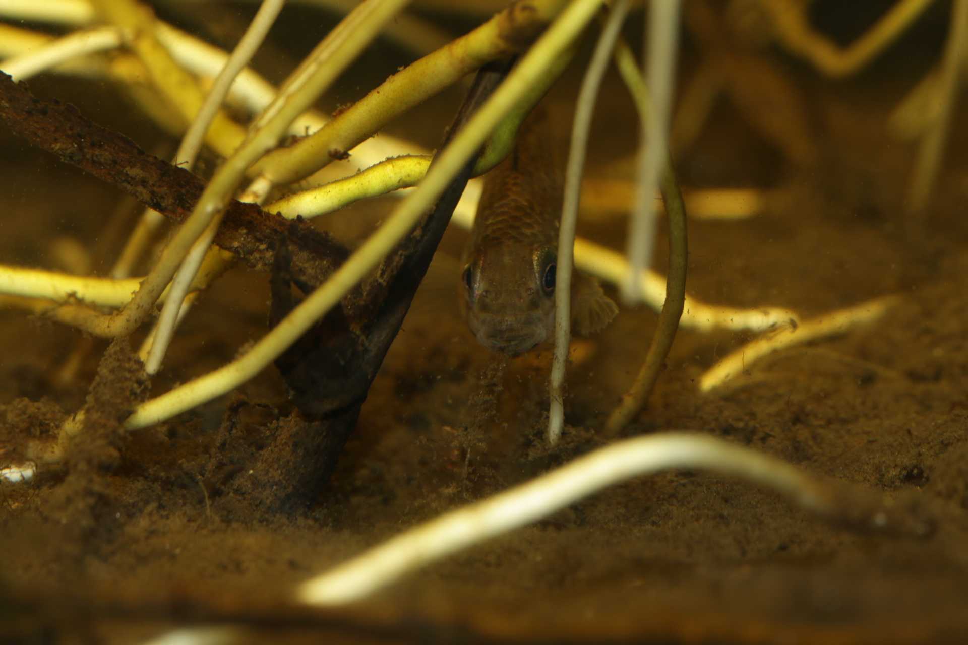 Ich pflegte die Gruppe bestehend aus fünf Tieren zunächst in einem 100x40x50 cm (LxBxH) großen Aquarium (200 Liter). Das Aquarium wurde mit Sand befüllt, enthielt strukturgebende Mangrovenwurzeln, Eichenlaub, einige Nussschalen und Blumentöpfe als Höhlen, einige auf Lavagestein aufgebunde Javafarne sowie Wurzeln einer Efeutute. Bereits nach wenigen Tagen bildete sich ein Pärchen, welches die freie Sandfläche für sich beanspruchte und vehement gegen die drei restlichen Artgenossen verteidigte, welche fortan im Unterholz leben mussten. Schnell zeigte sich die hohe innerartliche Aggressivität dieser Art. Rückblickend betrachtet war das Aquarium zu offen gestaltet und hätte mehr strukturgebende Sichtschutzelemente in der Beckenmitte benötigt.